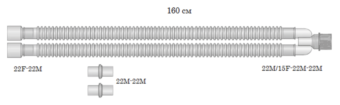 Трубка гофрированная 22, 2 шт, 1,6 м Y-образный коннектор 1 шт, 22М/15F-22М-22М без портов Коннектор прямой (на трубки) 2 шт, 22F-22М Коннектор прямой 2 шт, 22М-22М Тест-колпачок защитный 1 шт