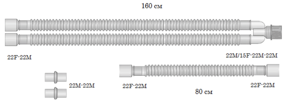 Трубка гофрированная 22, 2шт, 1,6 м Трубка гофрированная 22 (лимб), 1 шт, 0,8 м Y-образный коннектор 1 шт, 22М/15F-22М-22М без портов Коннектор прямой (на трубки) 4 шт, 22F-22М Коннектор прямой 2 шт, 22М-22М Тест-колпачок защитный 1 шт