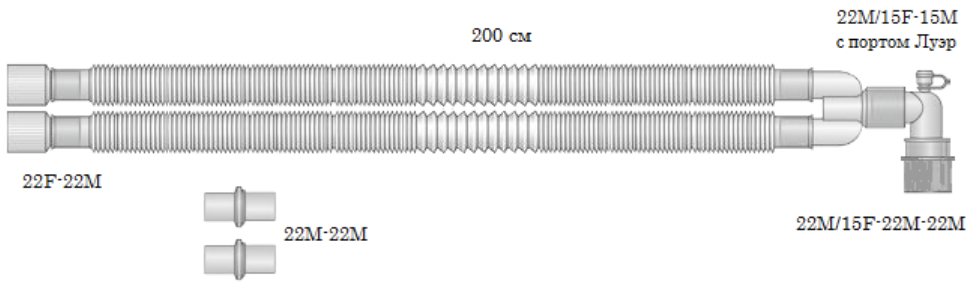 Трубка гофрированная 22, 2 шт, 2,0 м растяжимая Y-образный коннектор 1 шт, 22М/15F-22М-22М без портов Коннектор прямой (на трубки) 2 шт, 22F-22М Коннектор прямой 2 шт, 22М-22М Тест-колпачок защитный 1 шт Коннектор угловой 1 шт, 22М/15F-15М с портом Луэр