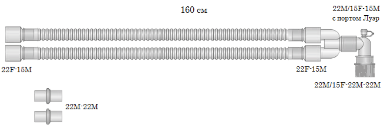 Трубка гофрированная 15, 2 шт, 1,6 м Y-образный коннектор 1 шт, 22М/15F-22М-22М без портов Коннектор прямой (на трубки) 4 шт, 22F-15М Коннектор прямой 2 шт, 22М-22М Коннектор угловой 1 шт, 22М/15F-15М с портом Луэр Тест-колпачок защитный 1 шт