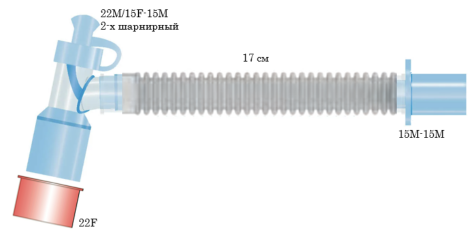 Трубка гофрированная, 15, 1шт, 17 см Соединитель 1шт, 22М/15F – 15М, 2-х шарнирный, с портом для санации и бронхоскопии Коннектор прямой (на трубку) 1шт, 15М-15М Тест-колпачок защитный 1шт, 22F
