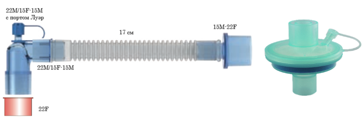 Трубка гофрированная, 15, 1 шт, 0,17 м, Соединитель 1 шт, 22М/15F – 15М с портом Луэр Коннектор прямой (на трубку) 1 шт, 22F-15М Коннектор прямой (на трубку) 1 шт, 22М/15F – 15М Фильтр с ТВО 1 шт, взрослый, нестерильный. Тест-колпачок защитный 1 шт, 22F